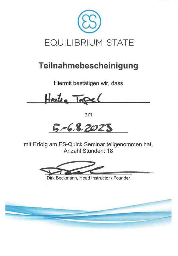 Es war klar, dass eine ganzheitliche und dauerhaft positive Auswirkung nur über das Lösen der verklebten Faszien in der Körperstruktur erfolgen konnte und ich begann mit der Ausbildung zum manuellen Faszien-Master Practitioner bei Dirk Beckmann ES Equilibrium State. Nach der ES-Body Ausbildung folgte das Erlernen von speziellen Mentaltechniken – ES-Mind – um auch mentale Blockaden zu lösen und so ein ganzheitliches und nachhaltiges Gleichgewicht zu erreichen: ES – Equilibrium State